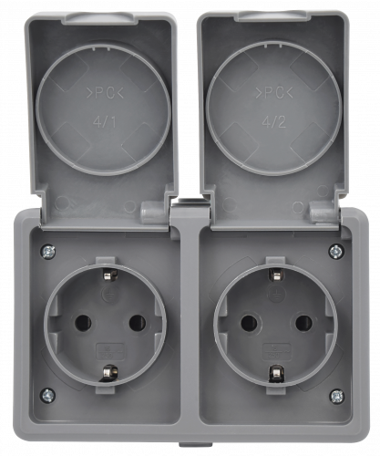 Tech-Details spritzwassergeschützte Aufputz Doppel-Steckdose Schutzklasse IP44 250V~/16A mit Einsteckschutz / Shutter hell-grauer Rahmen dunkel-grauer Deckel mit Federschließung Maße: 80x120x60mm horizontale Montage