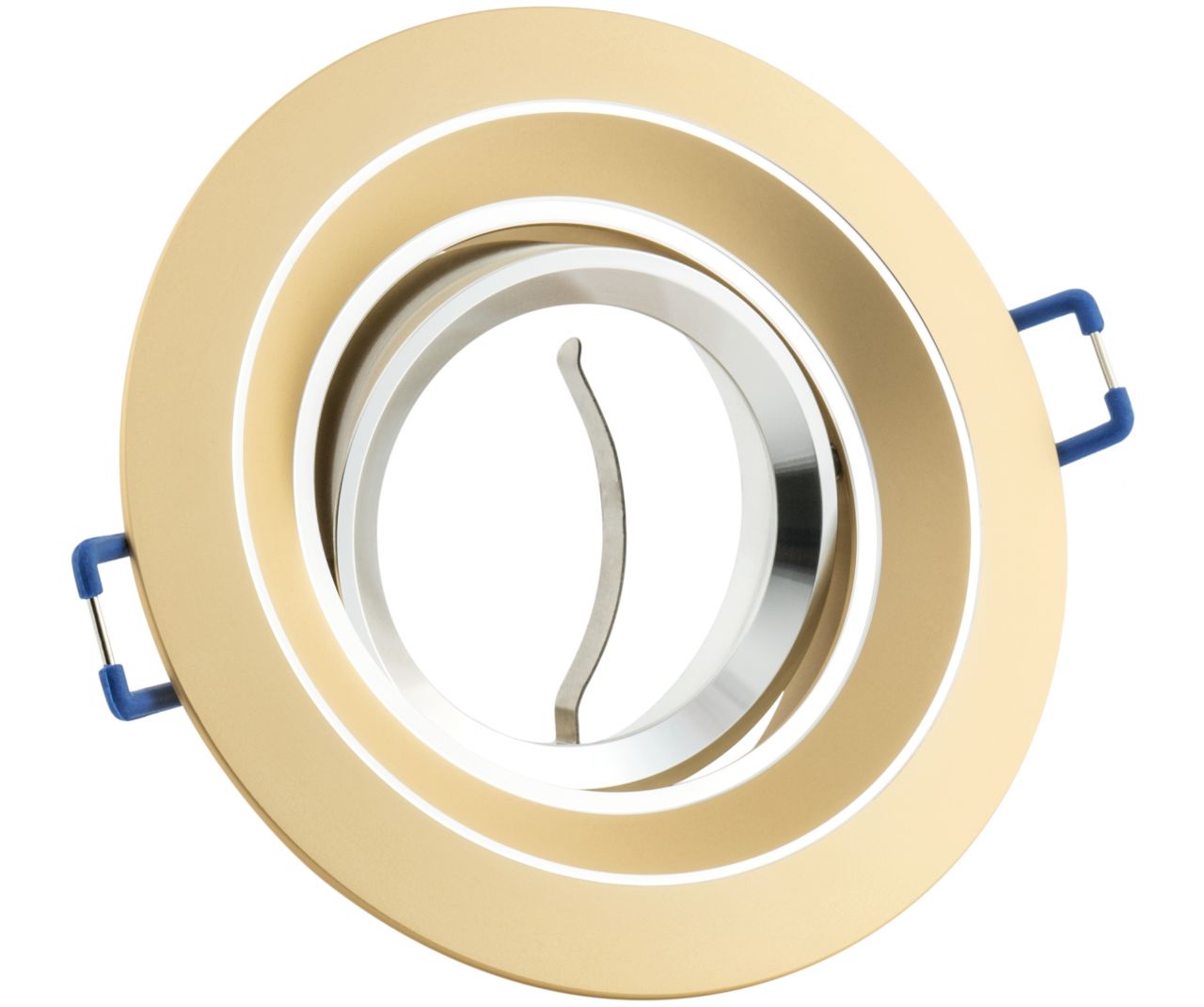 Hier finden Sie passende LEDs (einfach auf das Bild klicken und Sie gelangen zu den jeweiligen Kategorien):   Alle Details von Jim auf einen Blick: Außenmaß: 99mm Lochausschnitt (rund): 76mm – auch passend für vorhandene Löcher von 76-85mm Einbautiefe mit Leuchtmittel und Fassung: GU10 ca. 70mm / GU5,3 ca. 65mm Aufbauhöhe: 4mm Energieeffiziensklassenbereich: A – G Material: Aluminium Oberfläche: Gold matt / Silber Schwenkbar: Ja Schutzart: IP20 Max. Wattleistung Leuchtmittel: 15Watt (nicht für Halogenleuchtmittel geeignet) Leuchtmittelbefestigung: Klemmring – das Leuchtmittel wird von hinten eingesetzt Leuchtmittel austauschbar: Ja, LEDs austauschbar