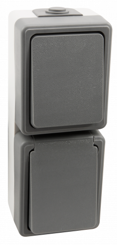 Tech-Details spritzwassergeschützte Kombi-Dose (1x Schalter, 1x Steckdose) Schutzklasse IP44 Steckdose 250V~/16A mit Einsteckschutz / Shutter Wechselschalter 250V~/10A hell-grauer Rahmen dunkel-grauer Deckel mit Federschließung bzw. Schalter Maße: 80x60x120mm vertikale Montage