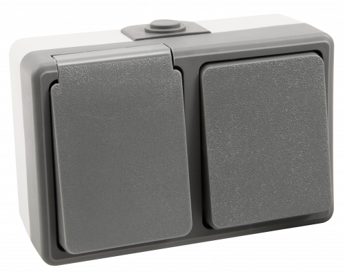 Tech-Details spritzwassergeschützte Aufputz Kombi-Dose (1x Schalter, 1x Steckdose) Schutzklasse IP44 250V~/10A mit Einsteckschutz / Shutter hell-grauer Rahmen dunkel-grauer Deckel mit Federschließung Maße: 80x120x60mm horizontale Montage