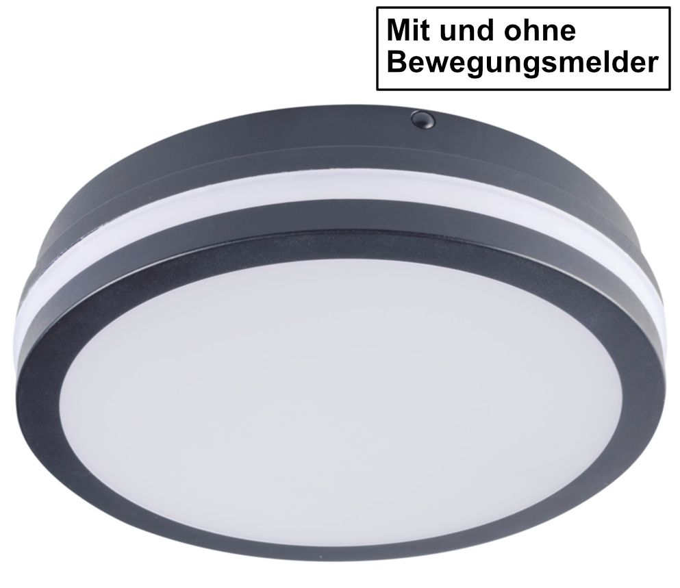 LED Decken- und Wandleuchte Beno – Anthrazit Rund – IP54 Lieferumfang: 1x Deckenleuchte Beno – mit oder ohne Bewegungsmelder (Auswahl direkt unter dem Preis) 1x Schrauben und Dübel zur sicheren Montage Details Beno: Der Anschluss erfolgt direkt an das 230Volt Stromnetz. Ein zusätzlicher Trafo wird nicht benötigt! Außendurchmesser: 18Watt: 220mm – 24Watt: 260mm Höhe: 55mm Anwendungsbereich: Innen und Außen Einbauort: Wandmontage, Deckenmontage Verbrauch: 18Watt oder 24Watt Lichtstrom: 18Watt: 1550Lumen – 24Watt: 2060Lumen Energieeffiziensklasse: A++ Farbtemperatur: 3000Kelvin warmweiß oder 4000Kelvin neutralweiß Material: Kunststoff Spannung: 220-240V AC Abstrahlwinkel: 110° Querschnittbereich der verwendeten Leitungen: 0,5-1,5mm2 Bewegungsmelder: Mikrowellen-Sensor – Einschaltzeit 5 Sekunden bis 5 Minuten Empfindlichkeitseinstellung: Ja Einstellbare Restlich-Beleu…