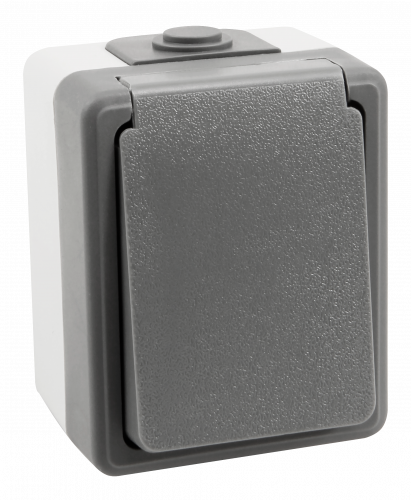 Tech-Details spritzwassergeschützte Aufputz Steckdose Schutzklasse IP44 250V~/16A mit Einsteckschutz / Shutter hell-grauer Rahmen dunkel-grauer Deckel mit Federschließung Maße: 80x64x60mm